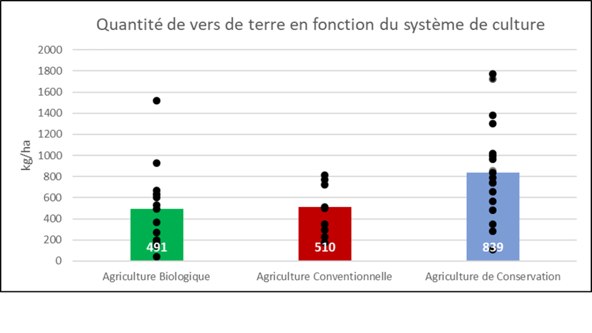 On peut citer brièvement quelques éléments contextuels. Les parcelles de grandes cultures en bio font généralement appel à plus de travail mécanique qu’en conventionnel ou en agriculture de conservation. La raison est que les agriculteurs bio doivent remplacer les herbicides par du travail mécanique (herses, bineuses) effectué en passages répétés de tracteurs sur le champ, ce qui perturbe les vers de terre. Mais il peut aussi y avoir de très bons résultats en bio, avec par exemple, l’emploi de la prairie temporaire de luzerne (2/3 ans) dans la rotation entre les cultures annuelles. Celle-ci permet de concurrencer les adventices et de constituer un stock d’azote organique dans la parcelle. L’absence de travail de sol et l’enracinement permanent pendant cette durée sont très favorables aux vers de terre.