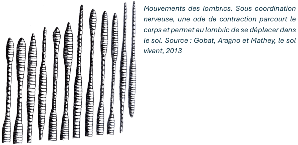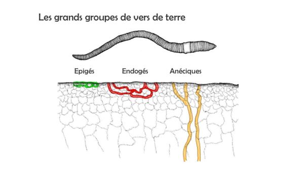 Enfin, quand le sol se tasse, soit par les pluies, le passage des animaux ou encore des engins agricoles, le ver doit dégager un passage pour garder une circulation libre via ses galeries. Selon la manière de prospecter le sol, il est possible de répartir les vers de terre en trois grands groupes :