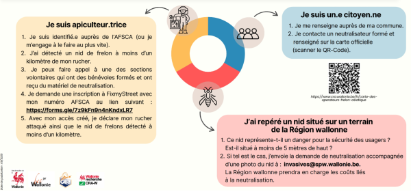 La neutralisation d’un nid de frelon asiatique est gratuite dans un rayon de 1 km autour des ruchers enregistrés auprès de l’AFSCA si la signalisation se fait par l’apiculteur via FixMyStreet : https://portail.fixmystreetwallonie.be/incident