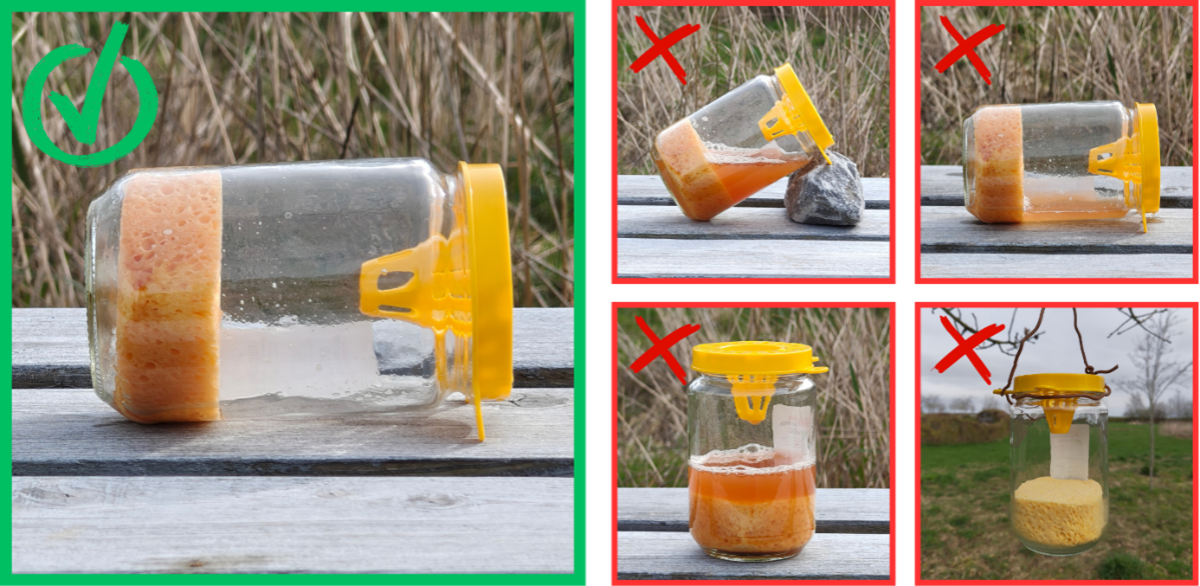 éviter les pièges à noyade, l’attractif doit être contenu dans un absorbant (éponge, sciure de bois, tissus)