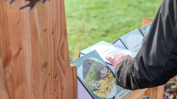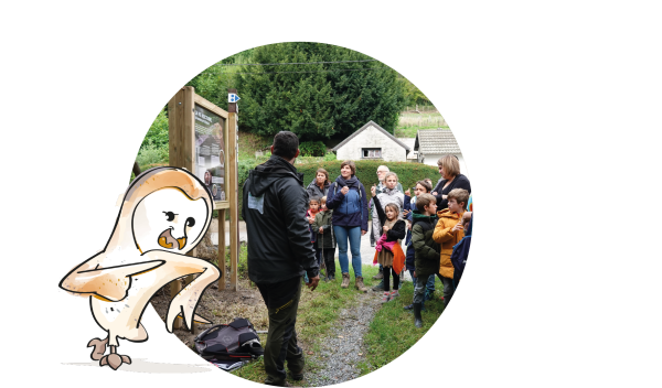 Le long de ce sentier, le promeneur suit Tyto, la Chouette effraie, qui loge dans le clocher de l’église et qui l’emmène sur les traces des animaux peuplant la région. Sur chaque panneau didactique jalonnant le parcours, un encart est destiné aux enfants avec des anecdotes, quizz, défis et jeux en tous genres. De quoi rythmer la promenade tout en apprenant des choses sur la nature qui nous entoure.